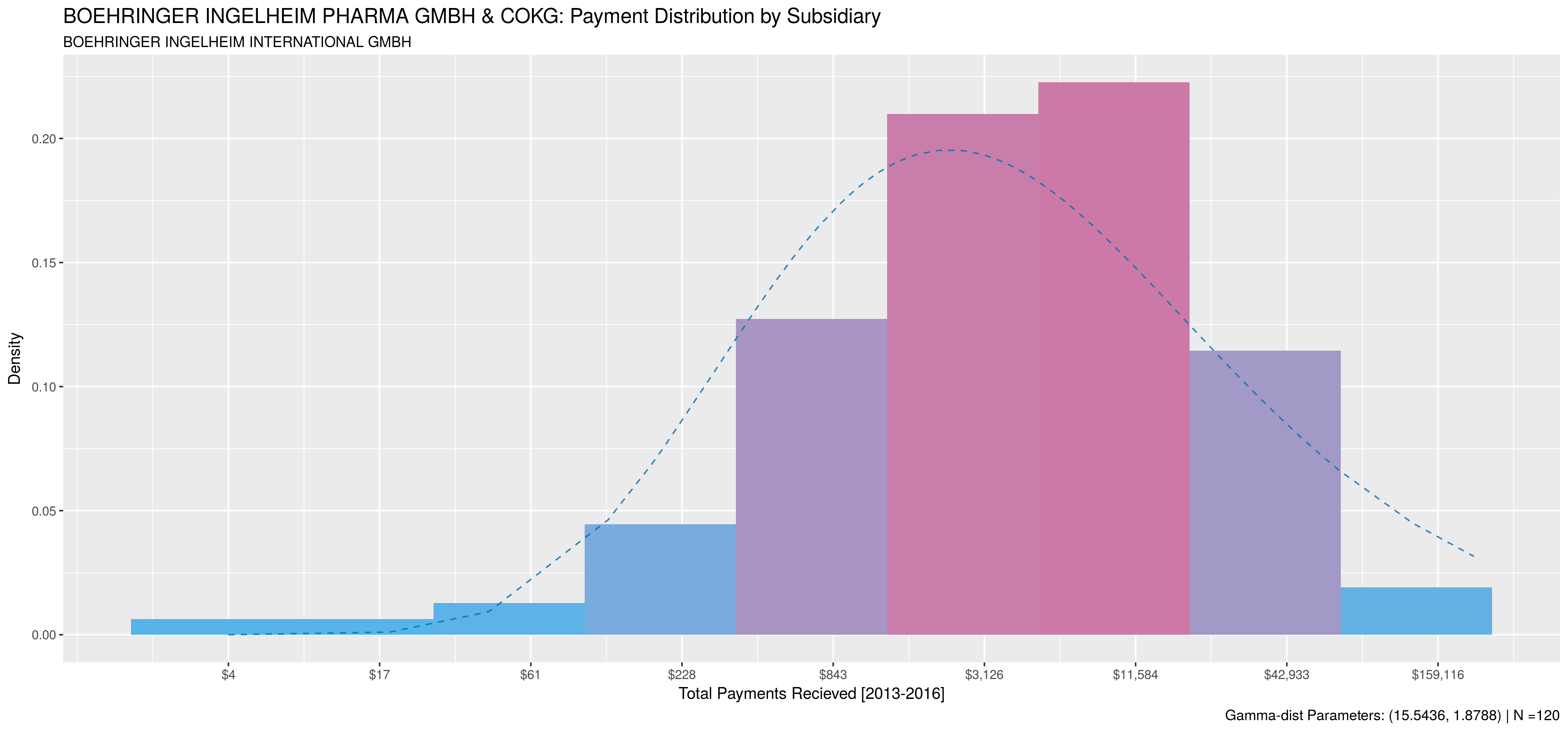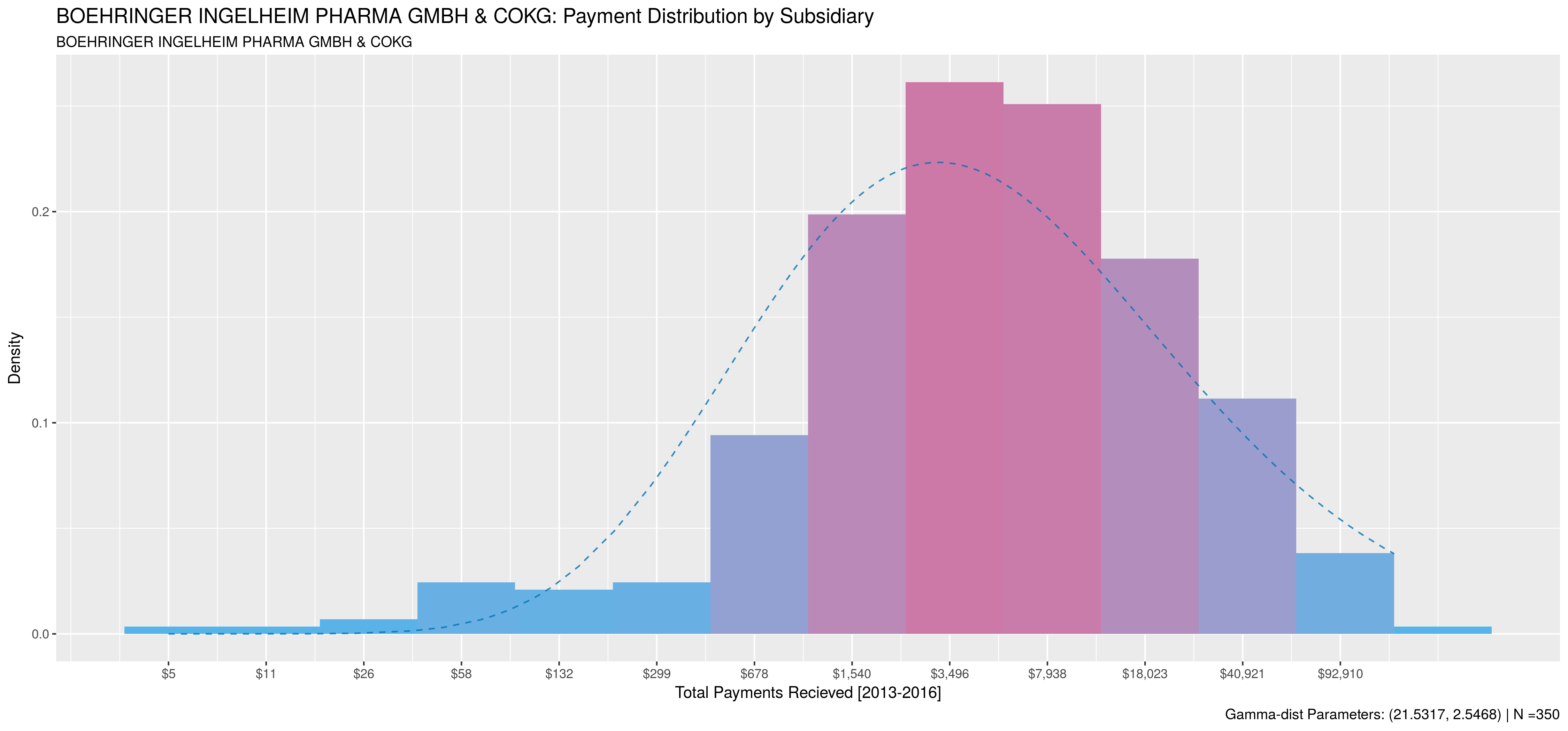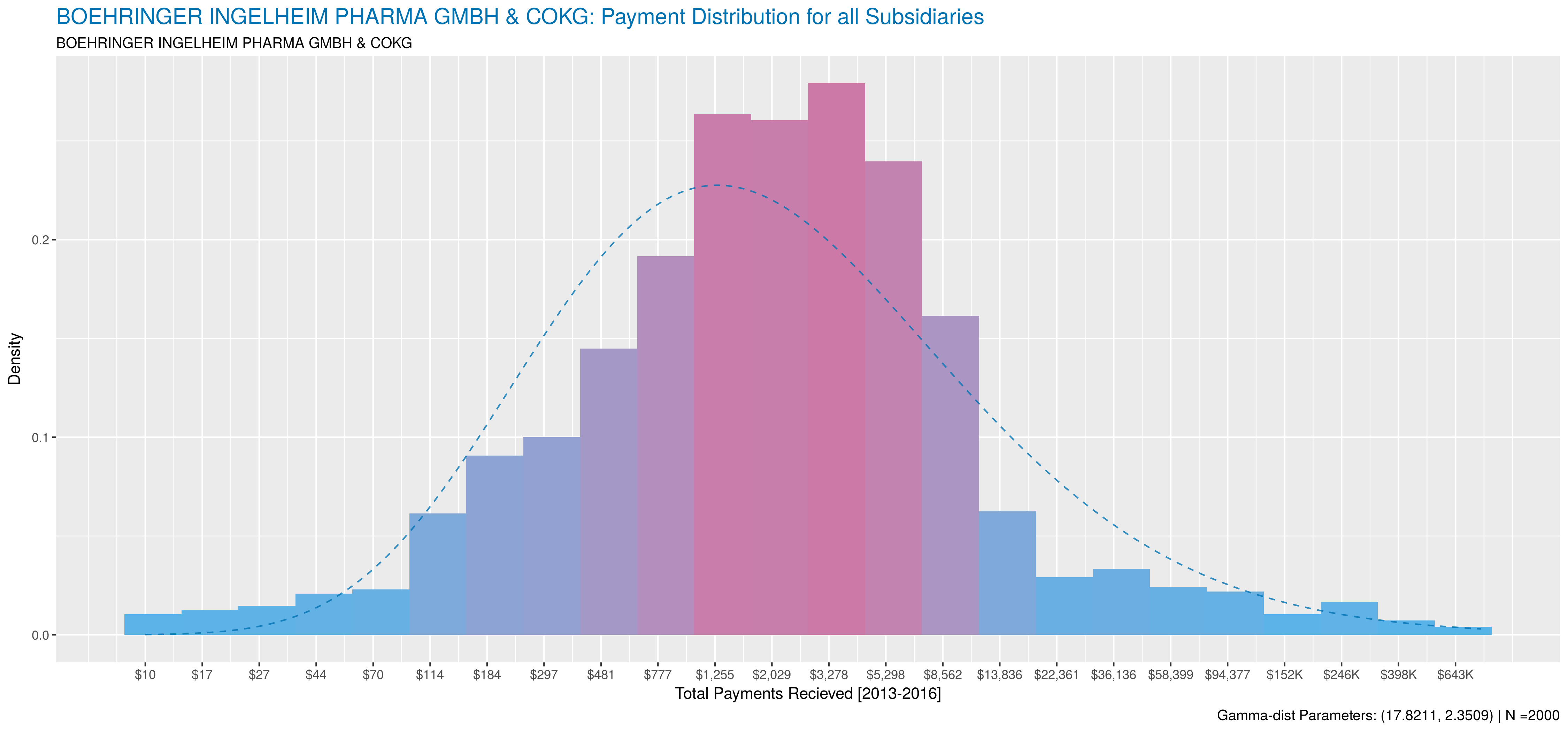 The following plots compare payment behaviour between the parent and it’s subsidiaries. Note, subsidiaries that made payments to less than 50 doctors were excluded. Payment data was aggregated at the doctor level for all activities between 2013 and 2016. A sample size of 2000 doctors was used when available, otherwise 75% of all doctors paid by the subsidiary were sampled. As with the previous post, data is plotted on a natural-log scale and natural-logs of sums were used to compute corresponding gamma-distribution.